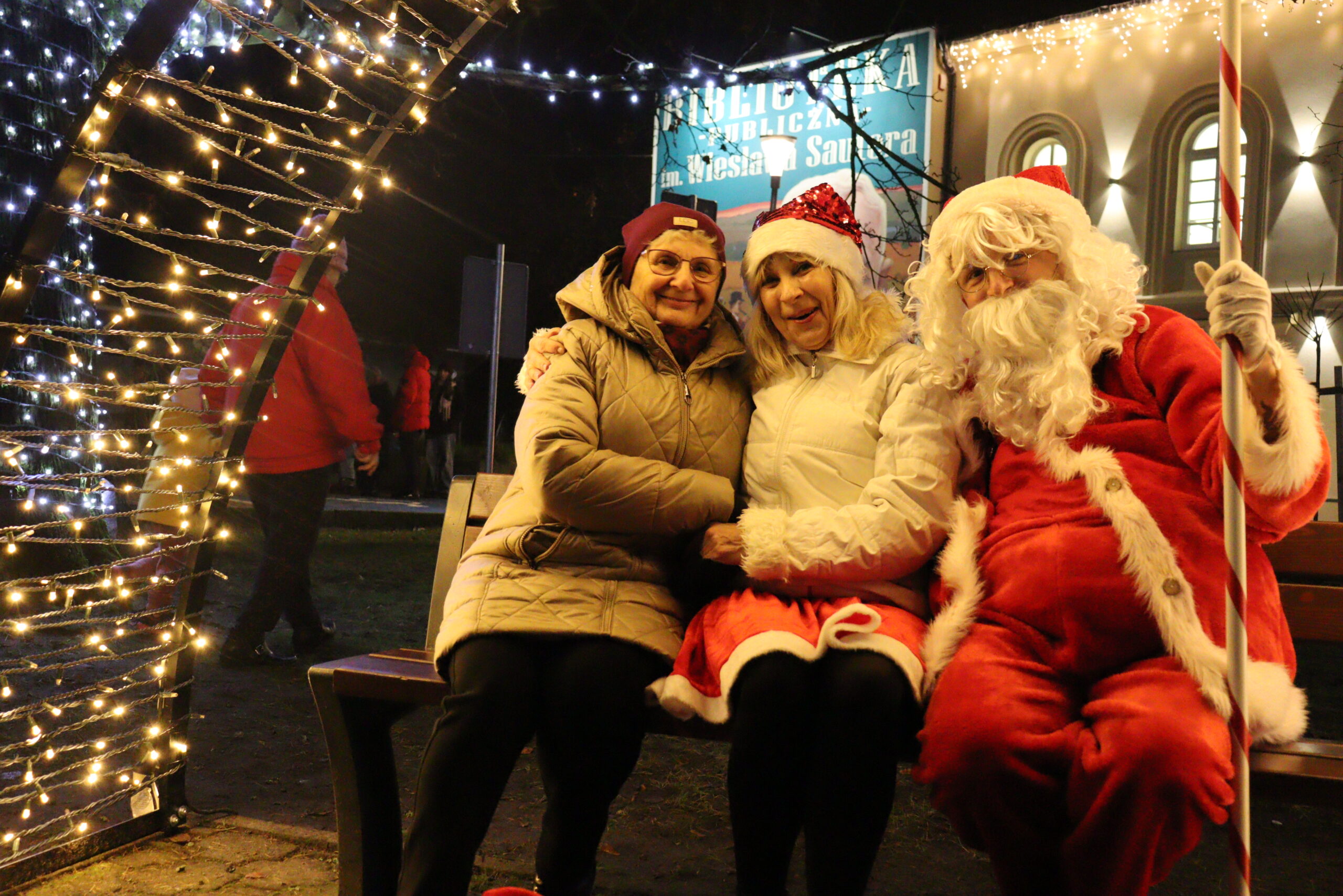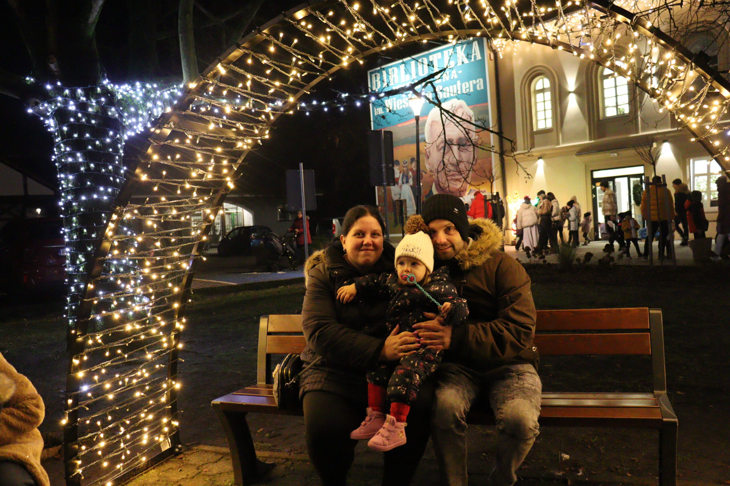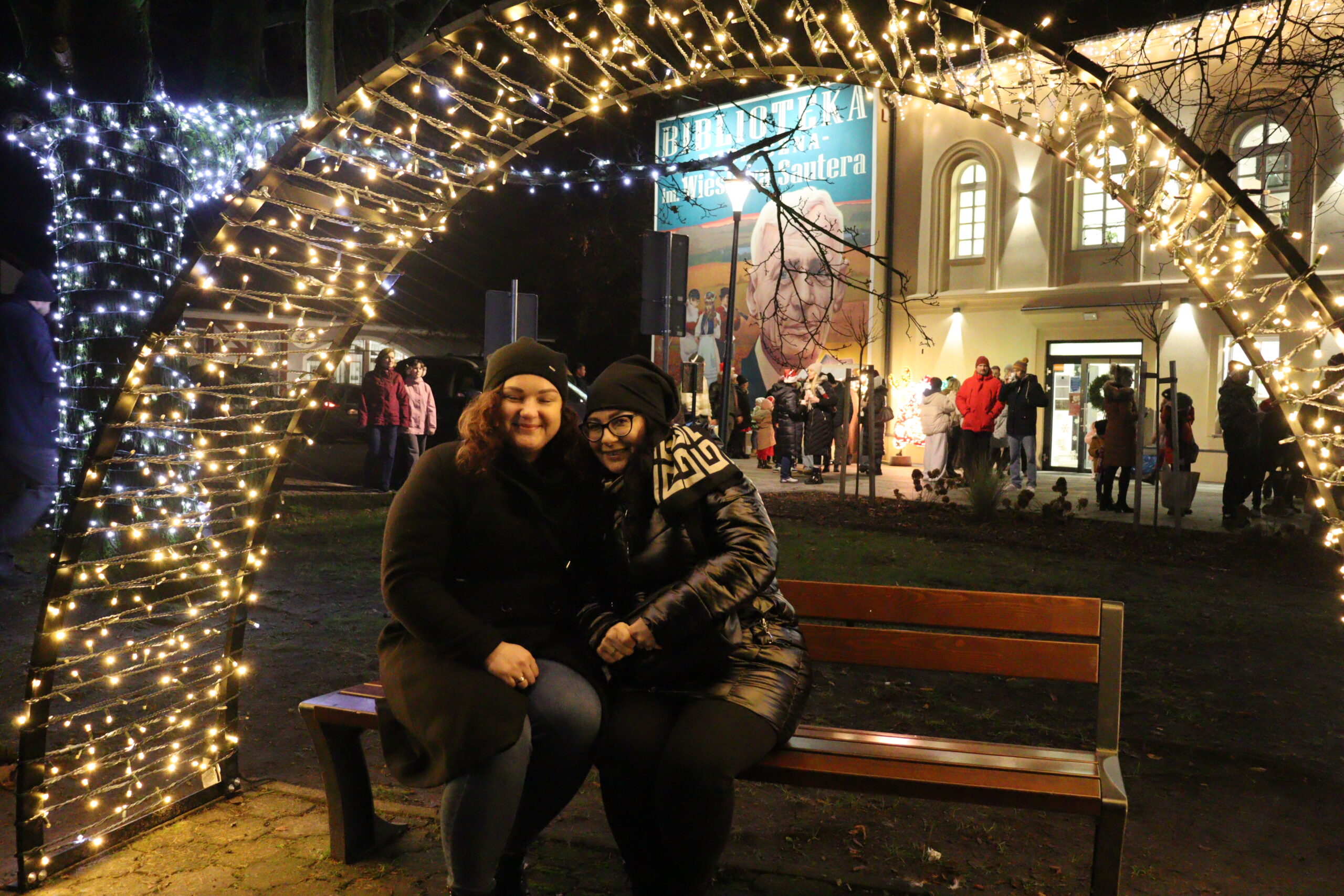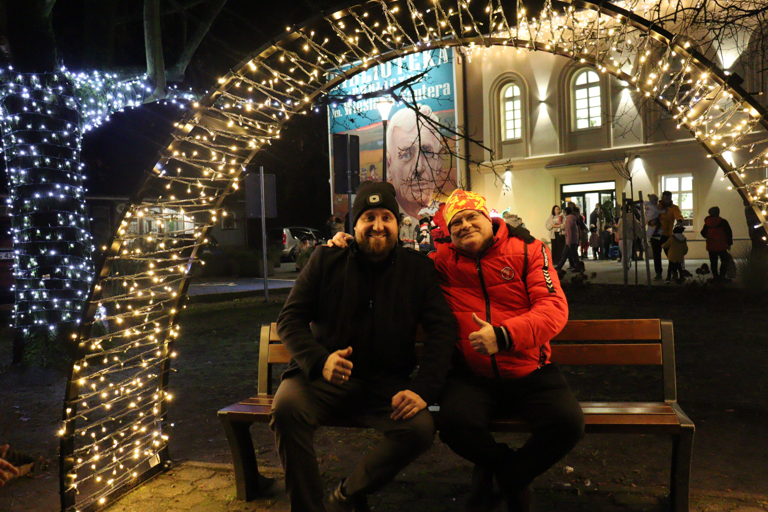 Po zapadnięciu zmroku odbyło się uroczyste uruchomienie świątecznej iluminacji. Park przed biblioteką rozbłysnął świątecznymi światłami, tworząc wyjątkową, magiczną scenerię. Kulminacyjnym momentem wydarzenia było wspólne włączenie świateł na gminnej choince, które zgromadziło uczestników w atmosferze radości i wspólnoty.