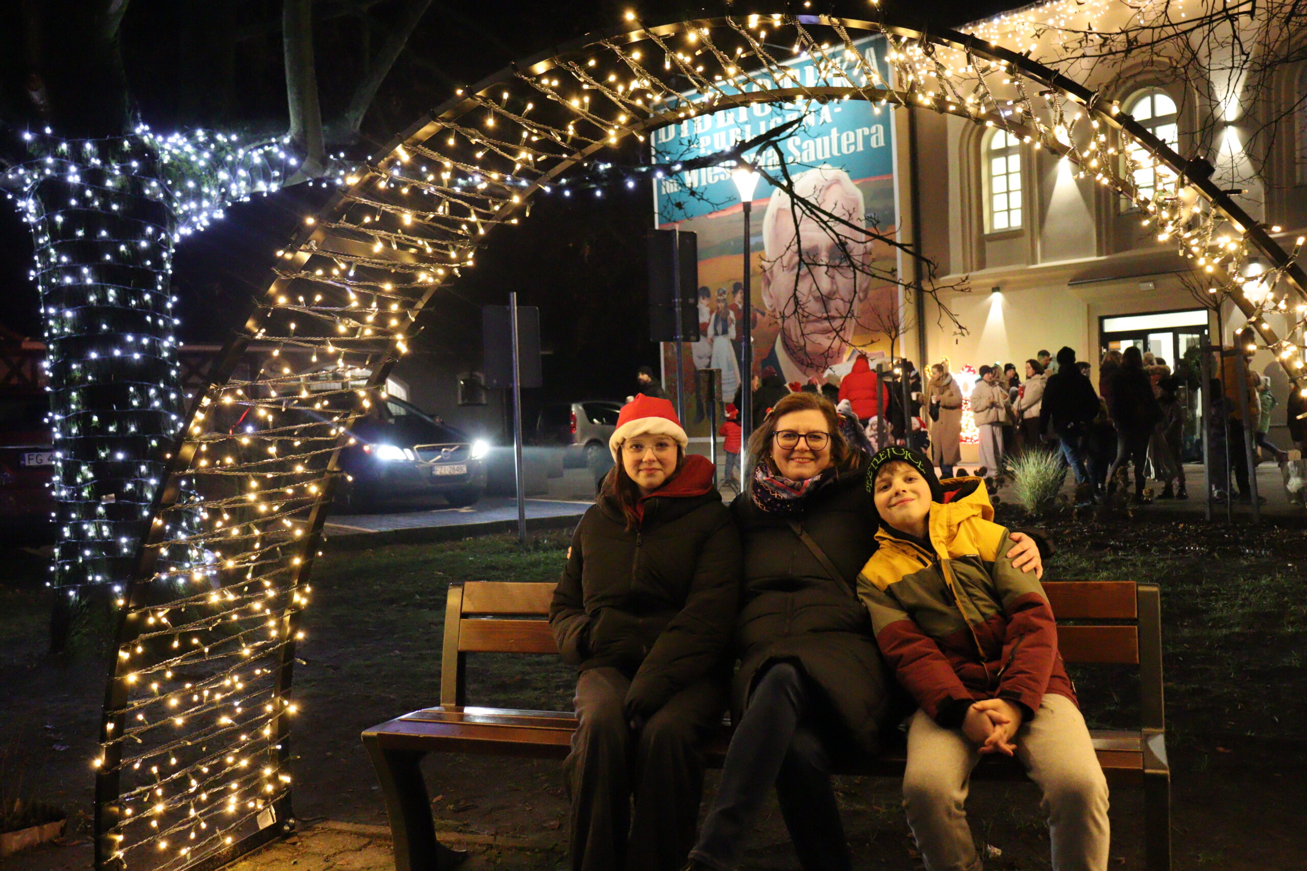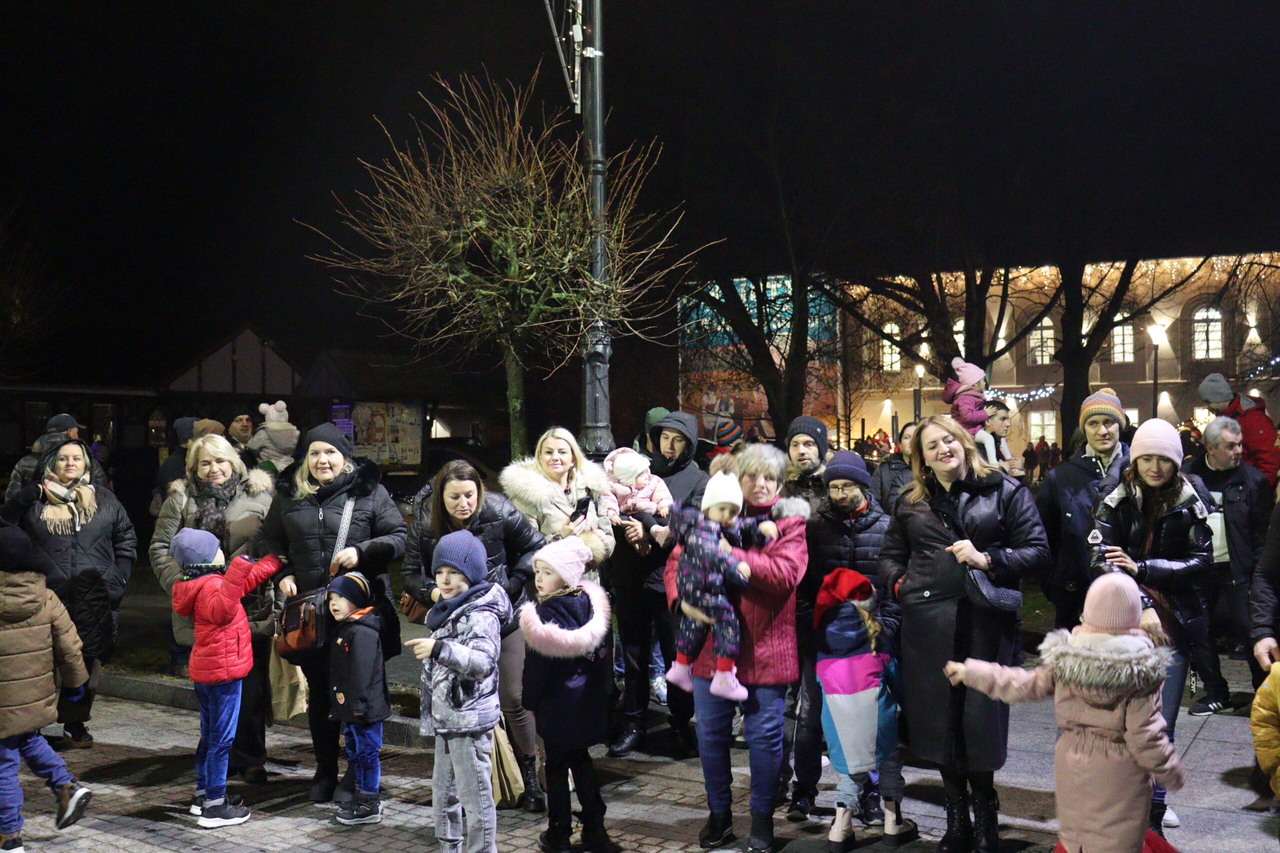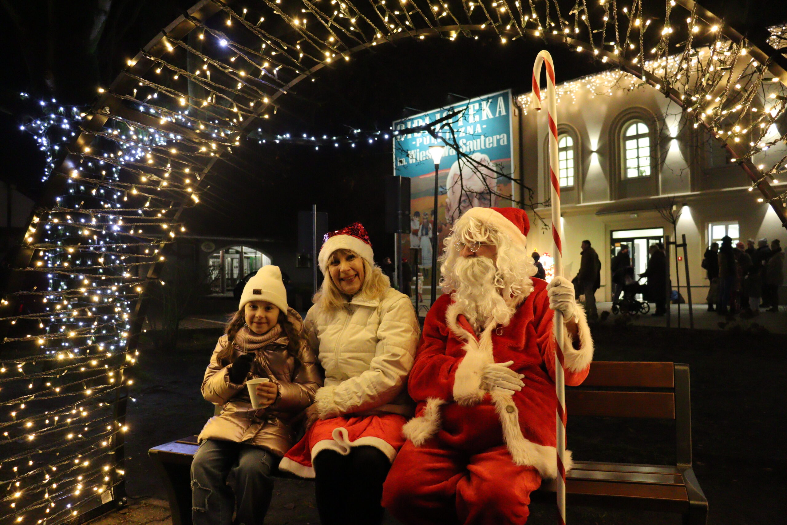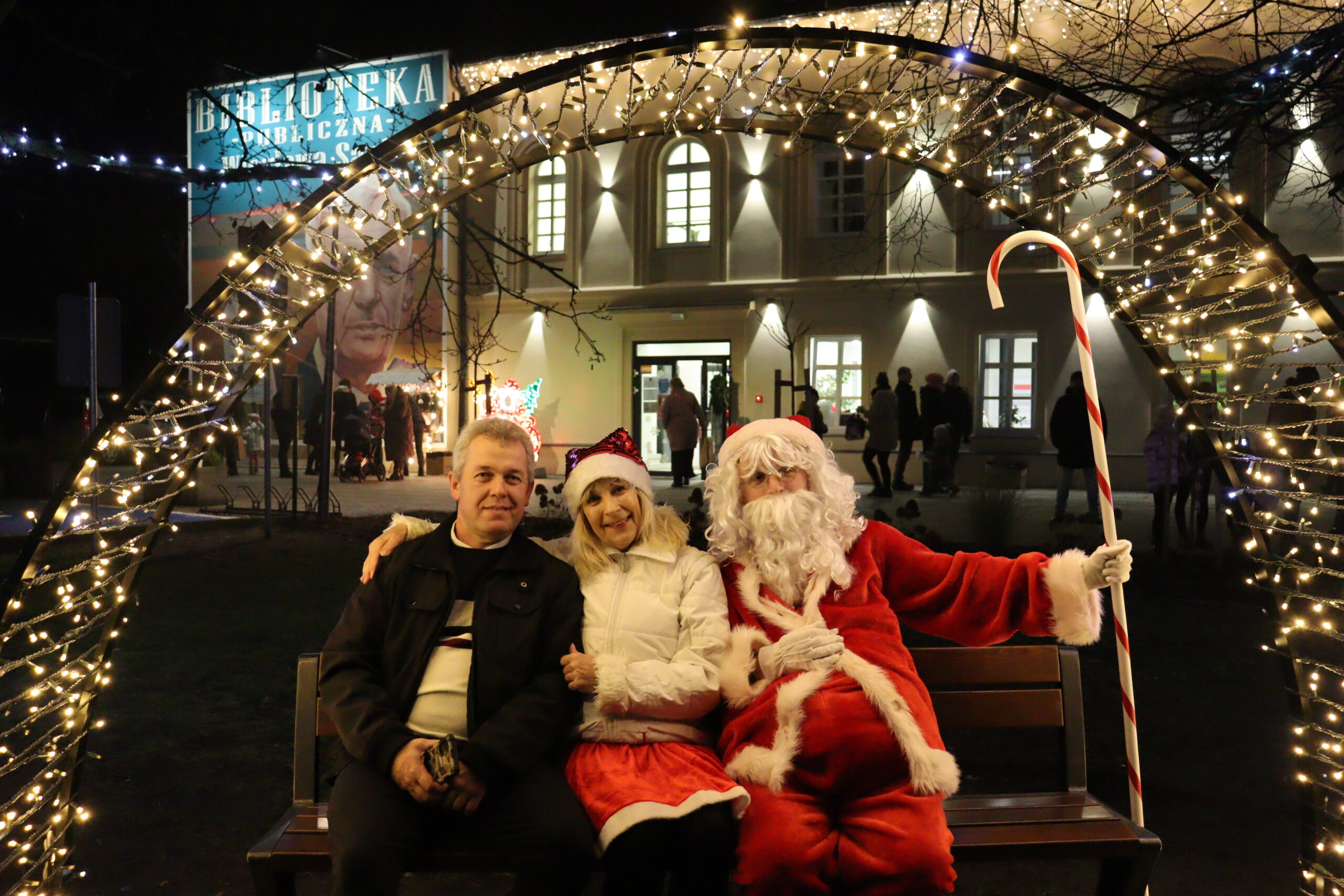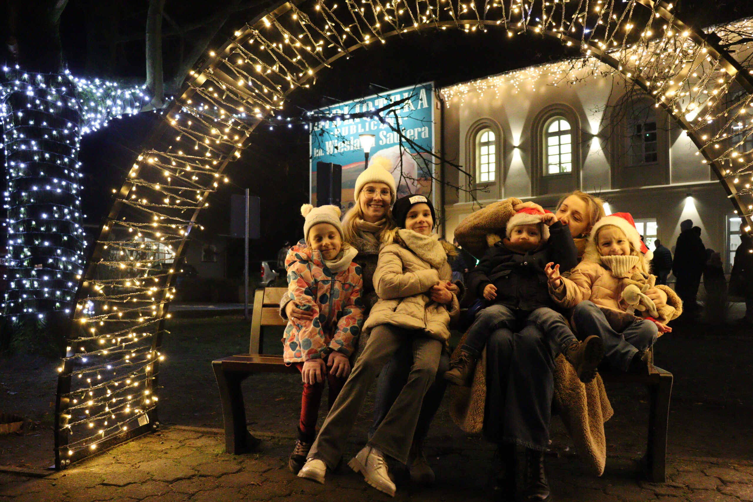 Po zapadnięciu zmroku odbyło się uroczyste uruchomienie świątecznej iluminacji. Park przed biblioteką rozbłysnął świątecznymi światłami, tworząc wyjątkową, magiczną scenerię. Kulminacyjnym momentem wydarzenia było wspólne włączenie świateł na gminnej choince, które zgromadziło uczestników w atmosferze radości i wspólnoty.
