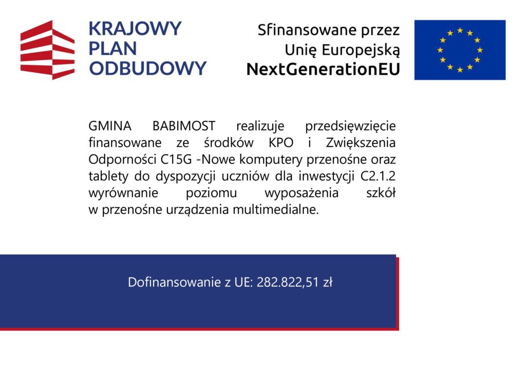 „Wdrażanie inwestycji C2.1.2 – Wyrównanie poziomu wyposażenia szkół w przenośne urządzenia multimedialne – inwestycje związane ze spełnieniem minimalnych standardów sprzętowych, wskaźnik C15G: Nowe komputery przenośne (laptopy, laptopy przeglądarkowe i tablety) do dyspozycji uczniów”.