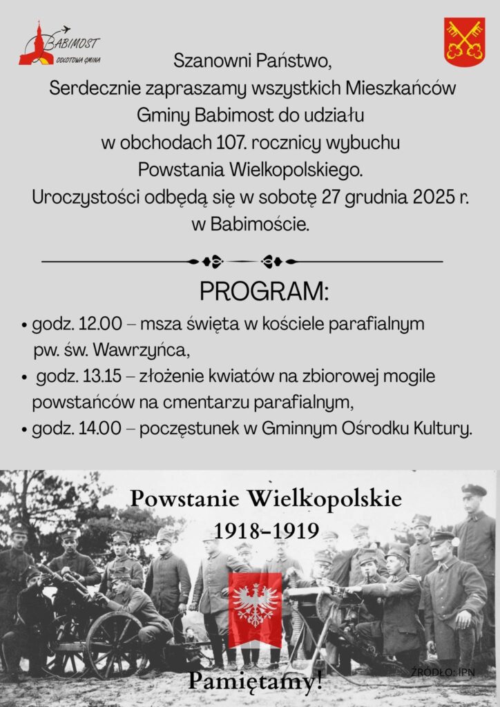 Serdecznie zapraszamy mieszkańców oraz gości do udziału w obchodach 107. rocznicy wybuchu Powstania Wielkopolskiego. To wyjątkowa okazja do wspólnego upamiętnienia bohaterów jednego z najważniejszych wydarzeń w historii walk o niepodległość Polski.
